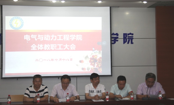 7月18日下午,学院于电力楼A105报告厅召开2018年上半年全体教职工大会。学院院长郭楚文,党委副书记兼行政副院长许宏志,科研、研究生副院长韩东太,教师代表张晓出席了本次会议,大会由学院党委书记伍小杰主持。