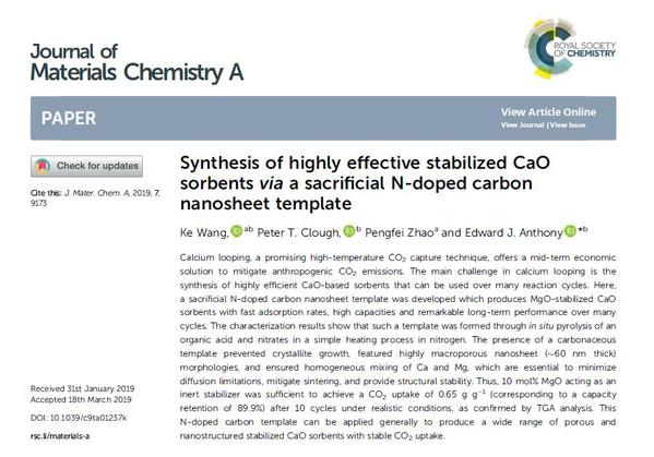 第一单位在英国皇家化学学会期刊Journal of Materials of Chemistry A (2018年IF = 9.93, 2019年即时IF=11.5) 上发表题为“Synthesis of highly effective stabilized-CaO sorbents via a sacrificial N-doped carbon”的论文(DOI: 10.1039/C9TA01237K)。