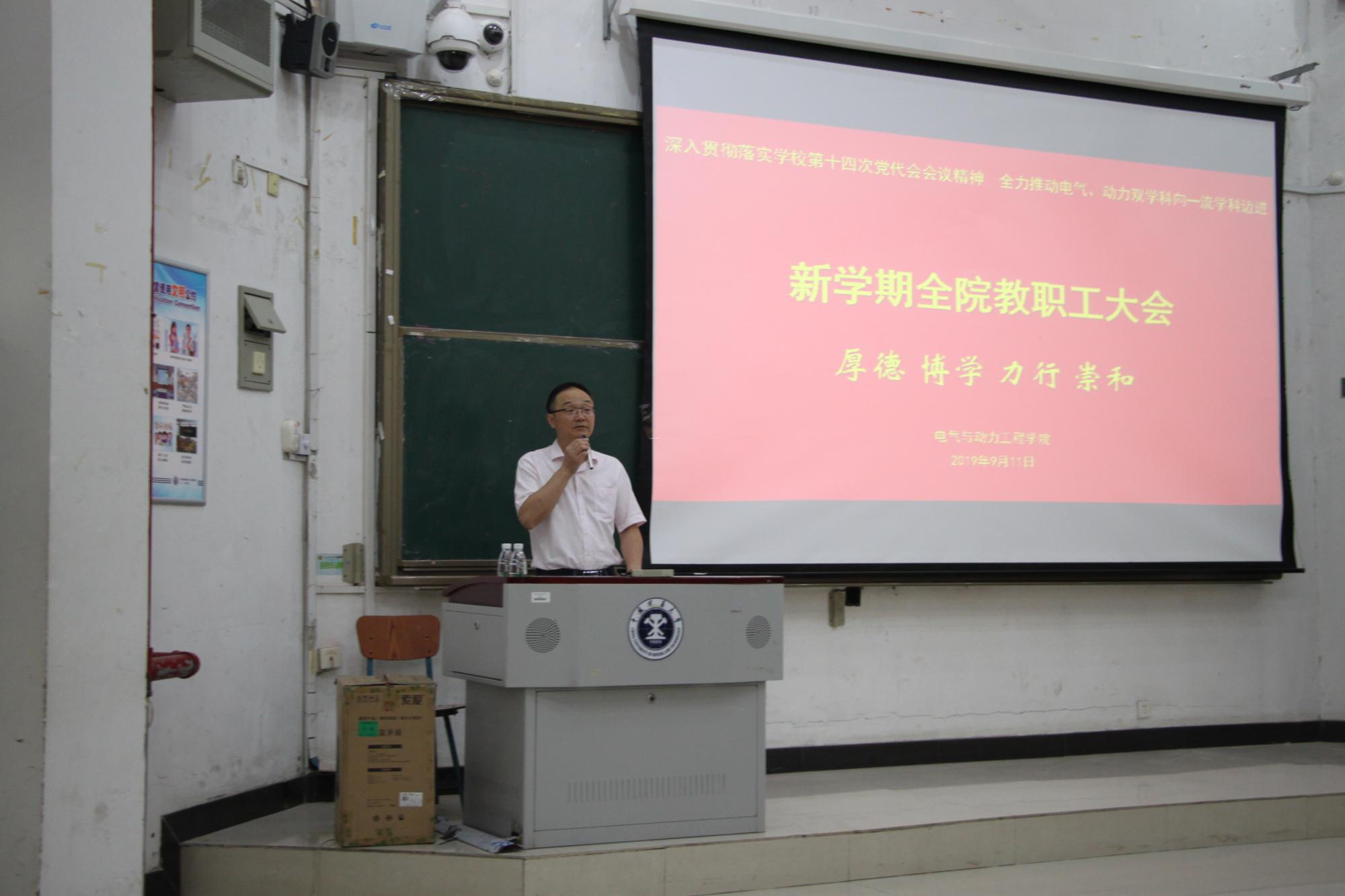 新学期全院教职工大会的召开,为新学期电力学院的教学进步指明了前进的方向,也鼓舞了全体教职工对教学工作的热情。相信电力学院今后一定能够再上新台阶。